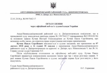 Після опублікування оголошення на офіційному веб-сайті суду, Кучма Павло Сергійович вважається повідомленим належним чином про час і місце розгляду справи. У разі неявки Кучми Павла Сергійовича в судове засідання справа буде розглянута у його відсутність.