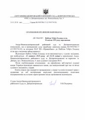Відповідач Набієв Тебріз Ельшад огли викликається у судове засідання, яке відбудеться 22 лютого 2018 року об 10.30 годині в приміщенні Амур-Нижньодніпровського районного суду м. Дніпропетровська за адресою: м. Дніпро, вул. Новоселівська, 9, зала судового засідання №18.