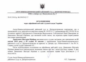 Амур-Нижньодніпровський районний суд м. Дніпропетровська повідомляє, що в провадженні суду знаходиться цивільна справа № 199/8742/17 (провадження №2/199/96/18) за позовною заявою Соболевського Олександра Васильовича, Соболевської Надії Дмитрівни до Даниленко Вікторії Юріївни, про визнання особи такою, що втратила право користування житловим приміщенням.