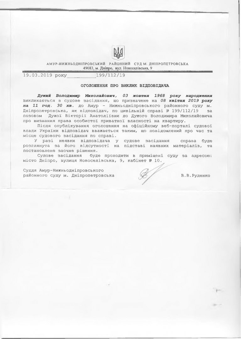 Виклик відповідача Дужий В.М. по цивільній справі № 199/112/19 за позовом Дужої В.А. (Суддя Руденко В.В.)