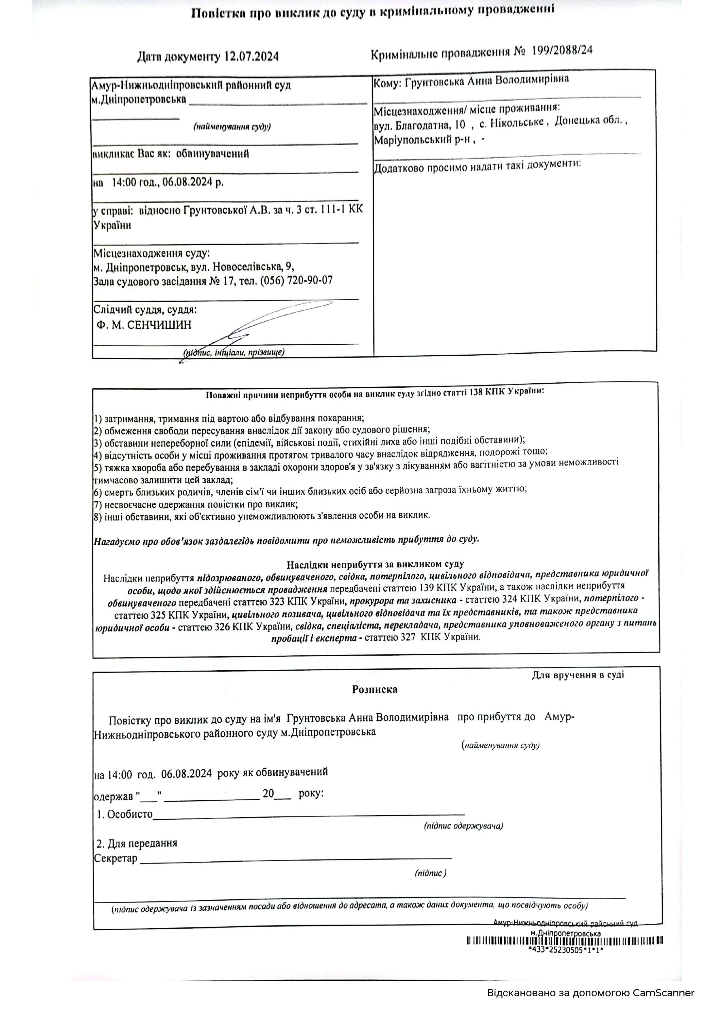 Амур-Нижньодніпровським районним судом міста Дніпропетровська (49083, м. Дніпро, вул. Новоселівська, б. 9) здійснюється спеціальне судове провадження у кримінальному провадженні, внесеному до ЄРДР під № 22023050000003094, за обвинуваченням ГРУНТОВСЬКОЇ АННИ ВОЛОДИМИРІВНИ у вчиненні злочину, передбаченого ч. 3 ст. 111-1 КК України (справа № 199/2088/24).
