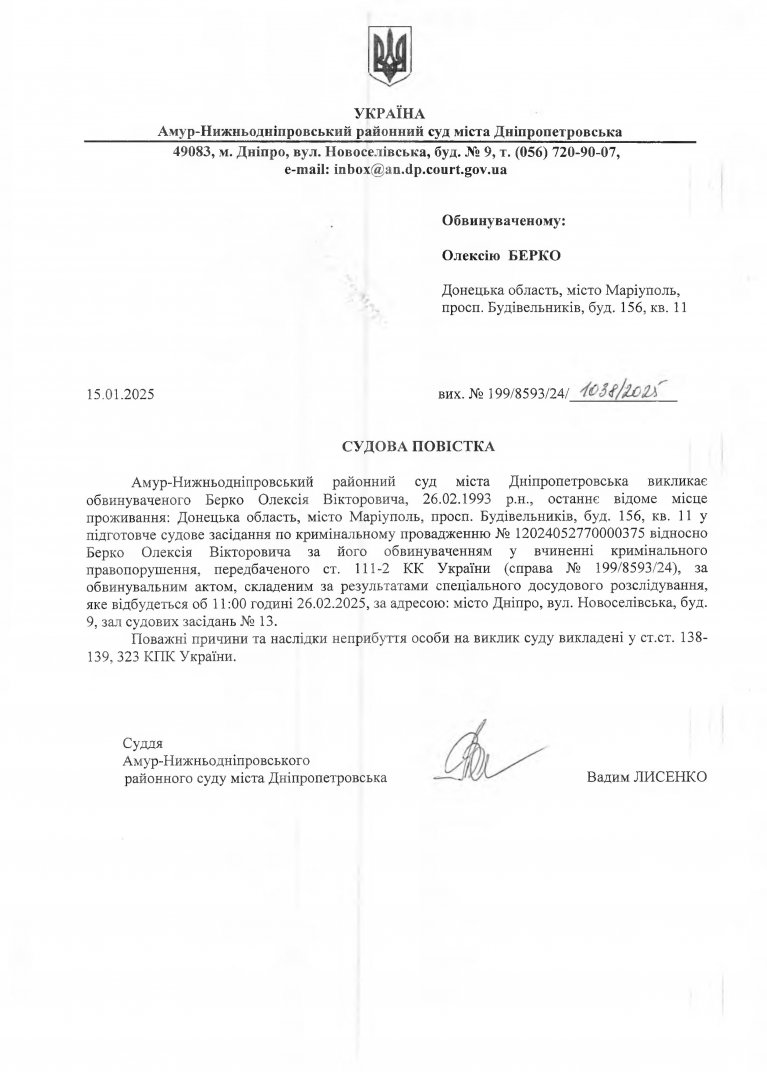 Амур-Нижньодніпровський районний суд міста Дніпропетровська викликає обвинуваченого Берко Олексія Вікторовича, 26.02.1993 р.н., останнє відоме місце проживання: Донецька область, місто Маріуполь, просп. Будівельників, буд. 156, кв. 11 у підготовче судове засідання по кримінальному провадженню № 12024052770000375 відносно Берко Олексія Вікторовича за його обвинуваченням у вчиненні кримінального правопорушення, передбаченого ст. 111-2 КК України (справа № 199/8593/24), за обвинувальним актом, складеним за результатами спеціального досудового розслідування, яке відбудеться об 11:00 годині 26.02.2025, за адресою: місто Дніпро, вул. Новоселівська, буд. 9, зал судових засідань № 13.