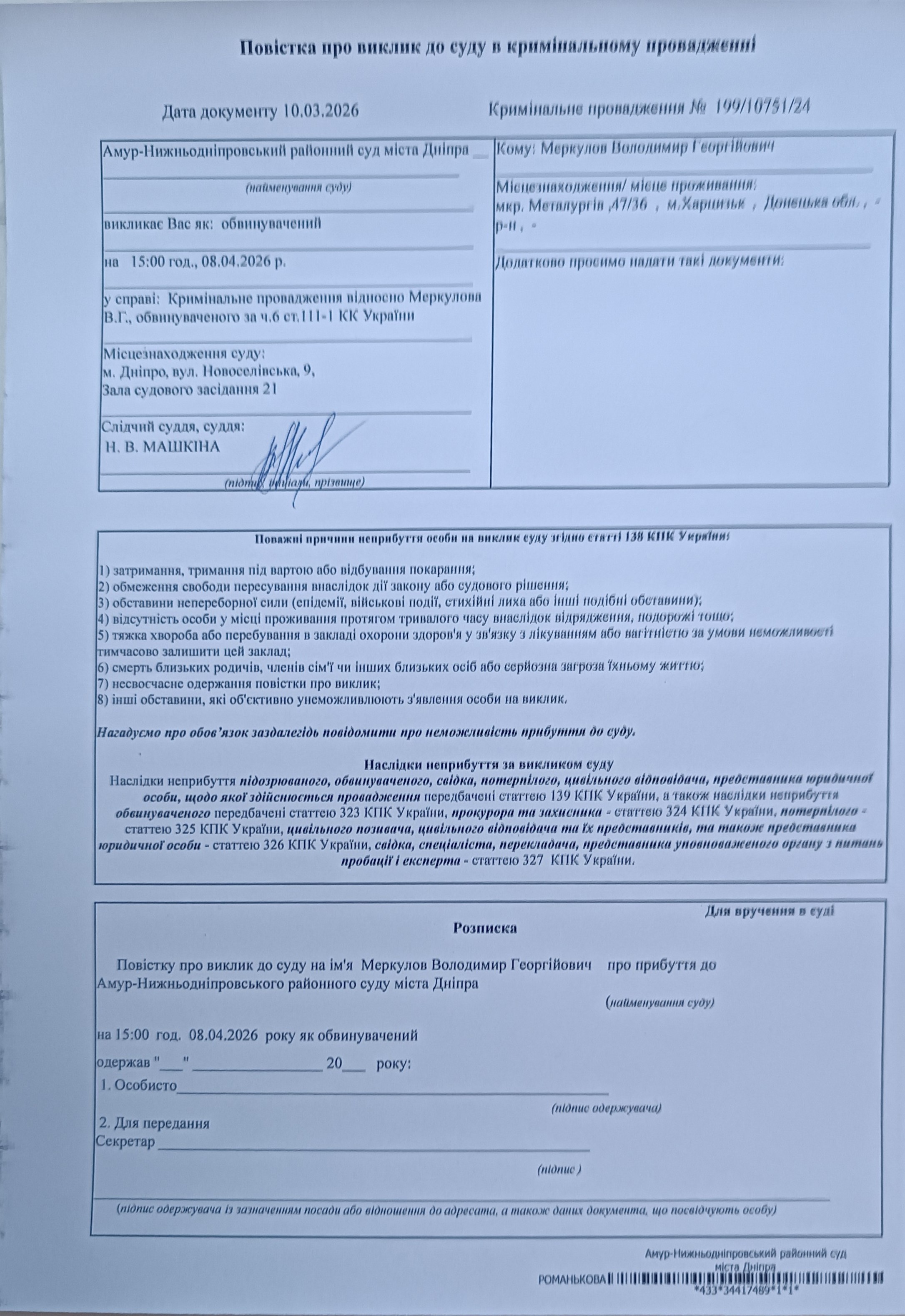 Амур-Нижньодніпровський районний суд міста Дніпра викликає Меркулова Володимира Георгійовича, 06.03.1958 р.н., уродженця м.Харцизьк, Донецької області, зареєстрованого за адресою: Донецька область, м.Харцизьк, мікрорайон Металургів, б.47, кв.36, як обвинуваченого у вчиненні злочину, передбаченого ч.6 ст. 111-1 КК України, у кримінальному провадженні, внесеному до Єдиного реєстру досудових розслідувань за №22024050000001803 від 19.06.2024 року, у судове засідання, яке відбудеться 08.04.2026 року о 15:00 год. у приміщенні Амур-Нижньодніпровського районного суду міста Дніпра, розташованого за адресою: м. Дніпро, вул. Новоселівська, б. 9.