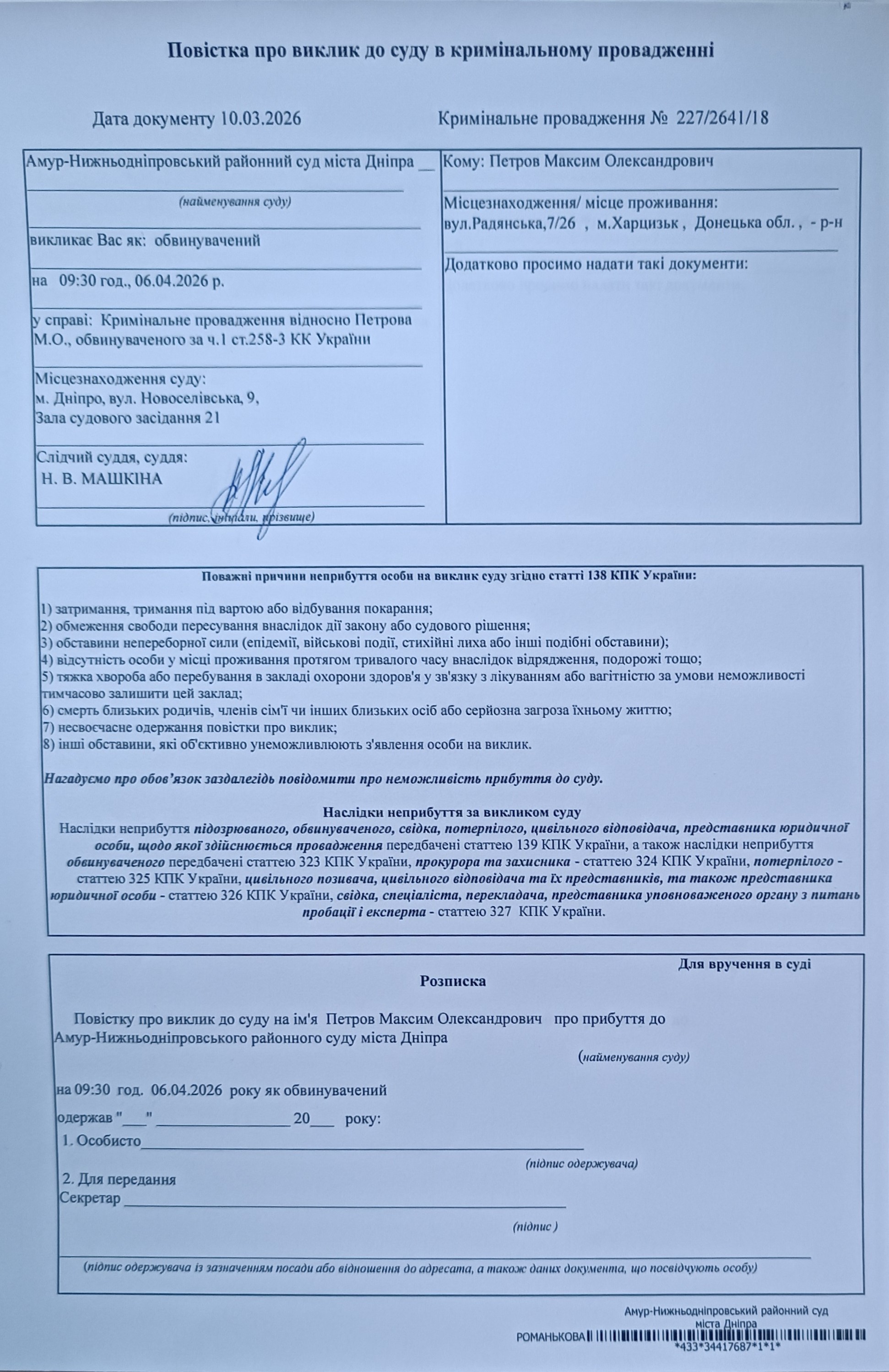 Амур-Нижньодніпровський районний суд міста Дніпра викликає Петрова Максима Олександрович, 31.01.1984 р.н., уродженця с.Харцизьк, Донецької області, зареєстрованого за адресою: Донецька область, м. Харцизьк, вул.Радянська, 7/26, як обвинуваченого у вчиненні злочину, передбаченого ч.1 ст. 258-3 КК України, у кримінальному провадженні, внесеному до Єдиного реєстру досудових розслідувань за №4201705000000067 від 22.08.2017 року, у підготовче судове засідання, яке відбудеться 06.04.2026 року о 09:30 год. в приміщенні Амур-Нижньодніпровського районного суду міста Дніпра, розташованого за адресою: м. Дніпро, вул. Новоселівська, б. 9.