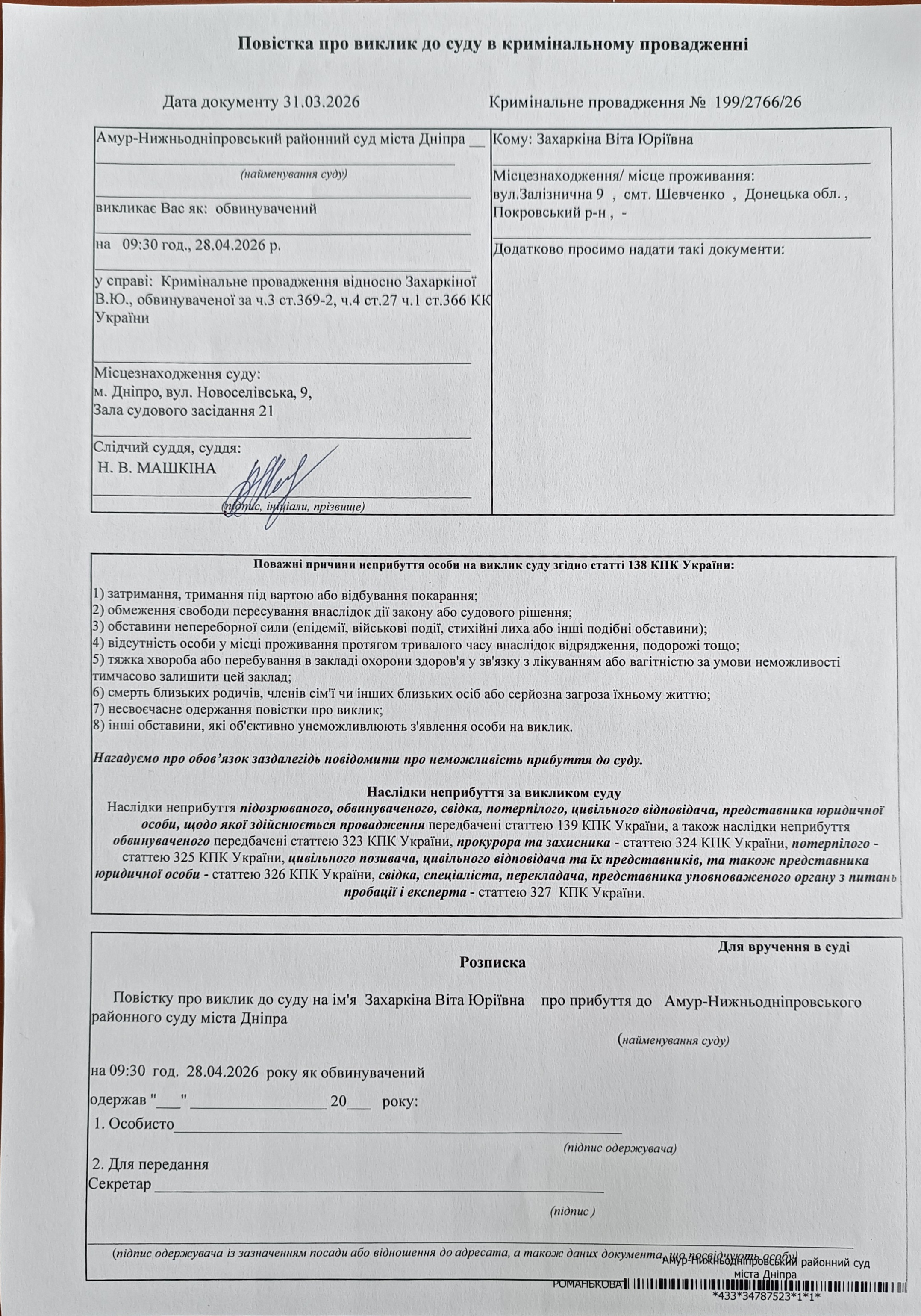 Амур-Нижньодніпровський районний суд міста Дніпра викликає Захаркіну Віту Юріївну, 30.10.1971 р.н., уродженку м.Красноармійськ Донецької області, зареєстровану за адресою: Донецька область, Покровський район, смт. Шевченко, вул.Залізнична, буд.9, як обвинувачену у кримінальному провадженні, внесеному до Єдиного реєстру досудових розслідувань за №42024050000000652 від 05.09.2024 року за ознаками кримінальних правопорушень, передбачених ч.3 ст.369-2, ч.4 ст.27 ч.1 ст.366 КК України, у підготовче засідання, яке відбудеться 28.04.2026 року о 09:30 год. у приміщенні Амур-Нижньодніпровського районного суду міста Дніпра, розташованого за адресою: м. Дніпро, вул. Новоселівська, б. 9.