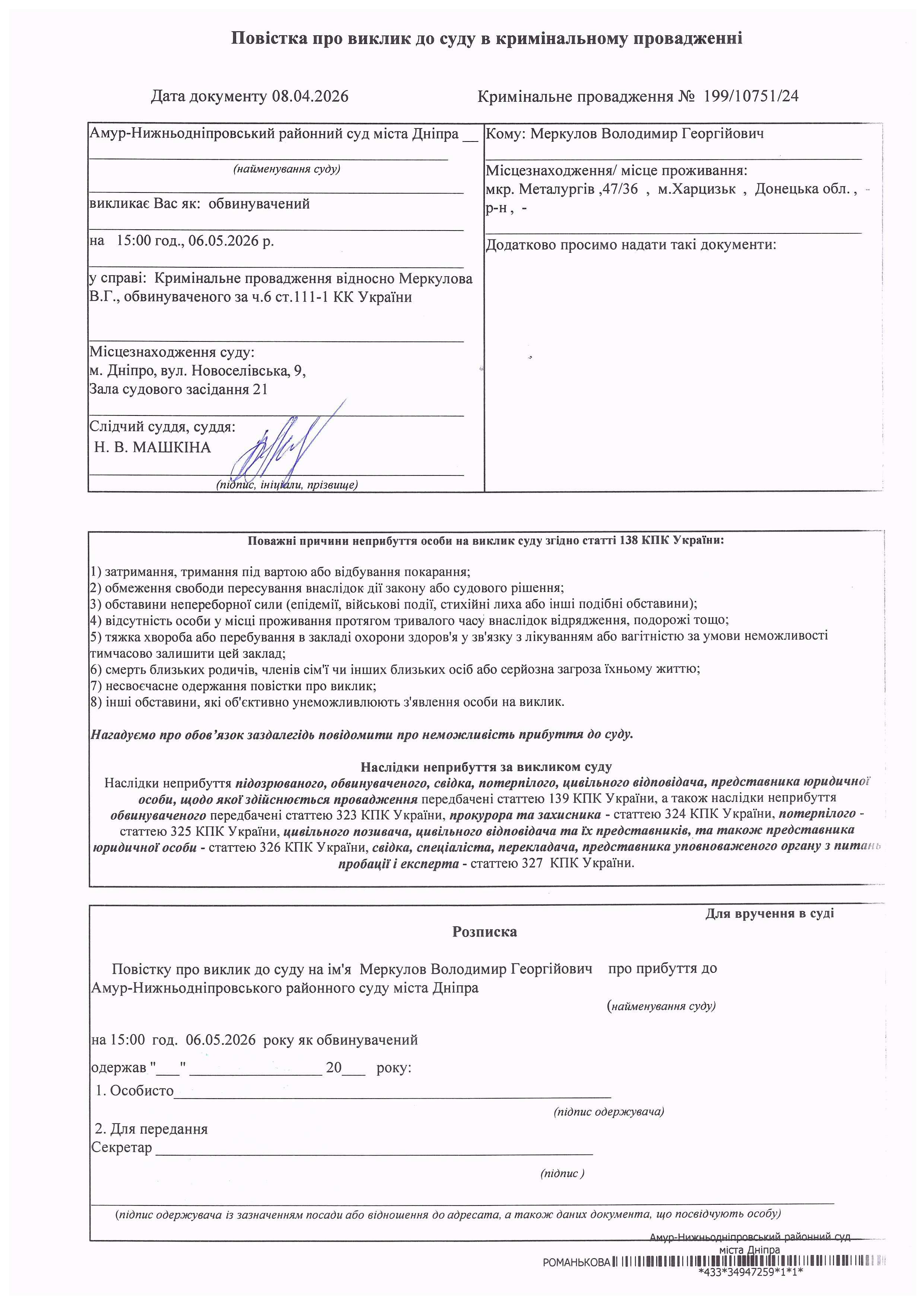 Амур-Нижньодніпровський районний суд міста Дніпра викликає Меркулова Володимира Георгійовича, 06.03.1958 р.н., уродженця м.Харцизьк, Донецької області, зареєстрованого за адресою: Донецька область, м.Харцизьк, мікрорайон Металургів, б.47, кв.36, як обвинуваченого у вчиненні злочину, передбаченого ч.6 ст. 111-1 КК України, у кримінальному провадженні, внесеному до Єдиного реєстру досудових розслідувань за №22024050000001803 від 19.06.2024 року, у судове засідання, яке відбудеться 06.05.2026 року о 15:00 год. у приміщенні Амур-Нижньодніпровського районного суду міста Дніпра, розташованого за адресою: м. Дніпро, вул. Новоселівська, б. 9.